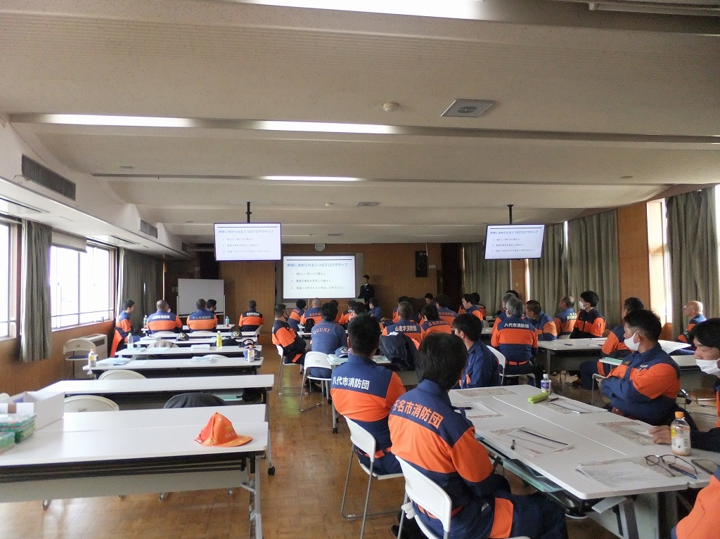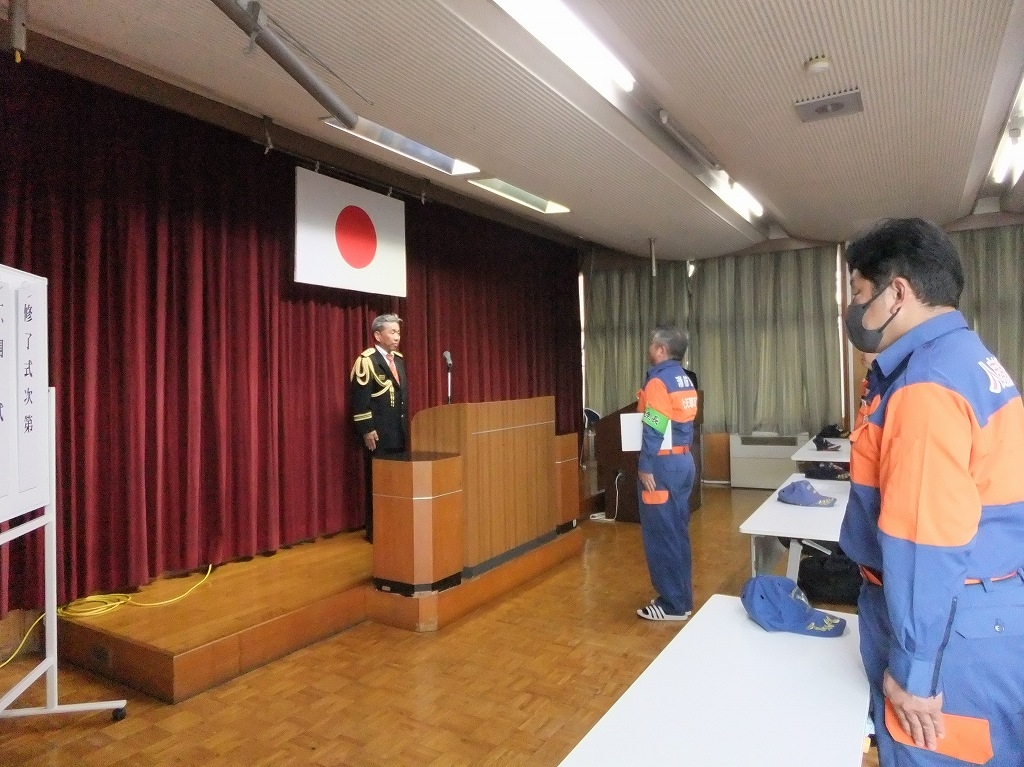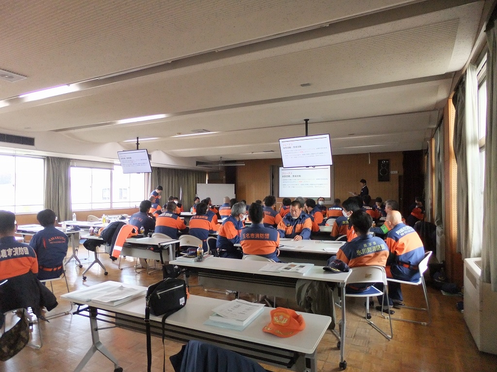 この研修は(公財)日本消防協会からの委託研修で、消防団員のリーダーとしの役割を担う人材を養成し、地域防災の要である消防団の充実・強化を図ることを目的として行っております。