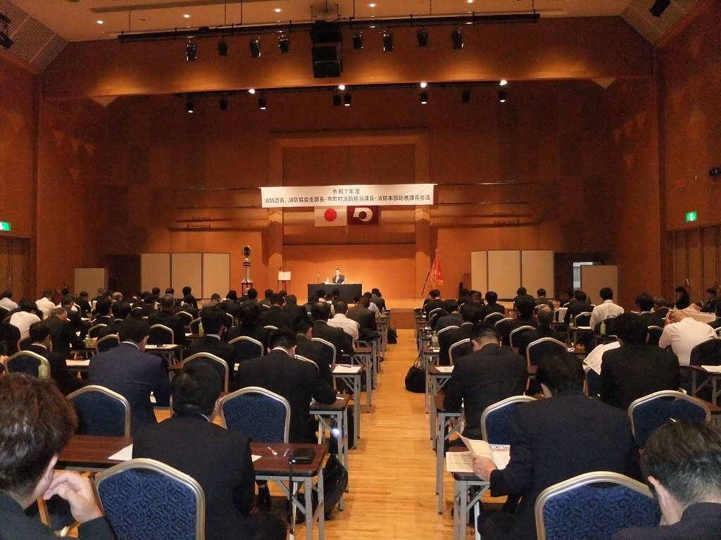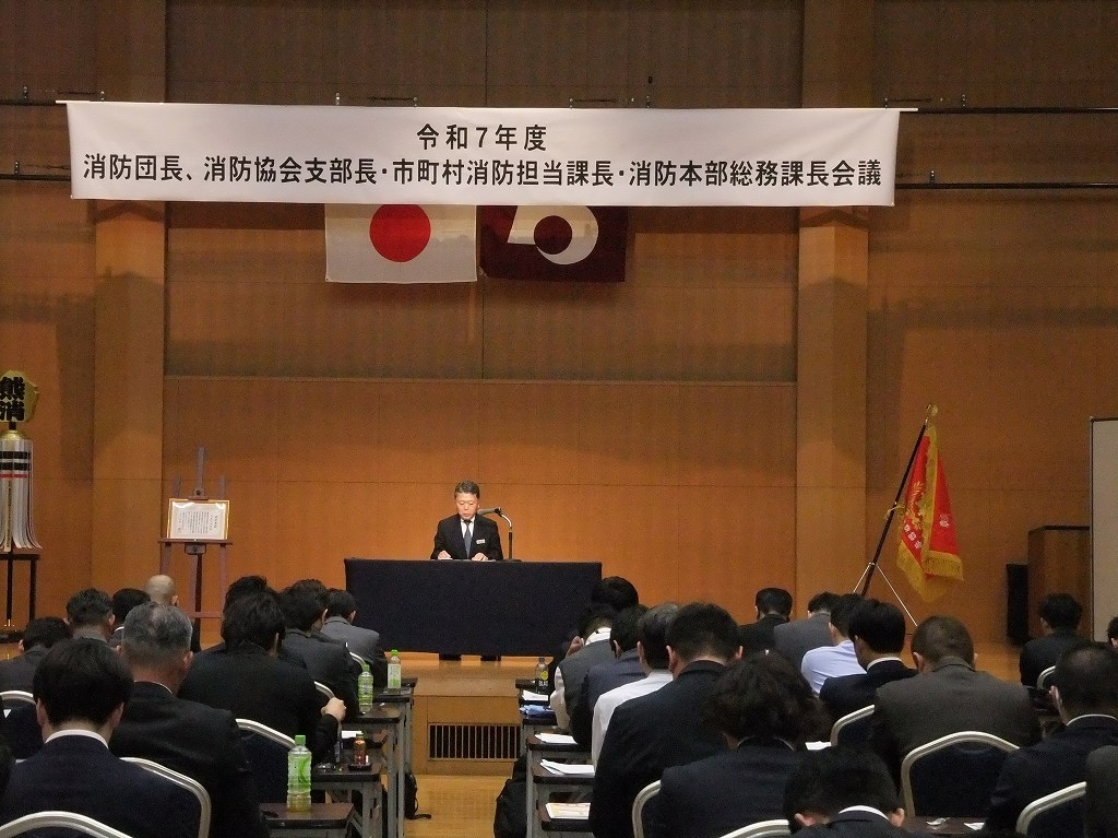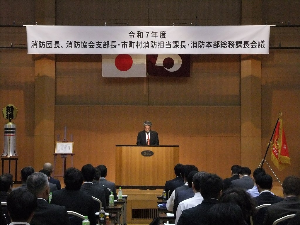 県内の消防団長、消防協会支部長・市町村消防事務担当課長・消防本部総務課長会議を令和7年5月22日(木)、ホテル熊本テルサで開催しました。参加者は約141名。